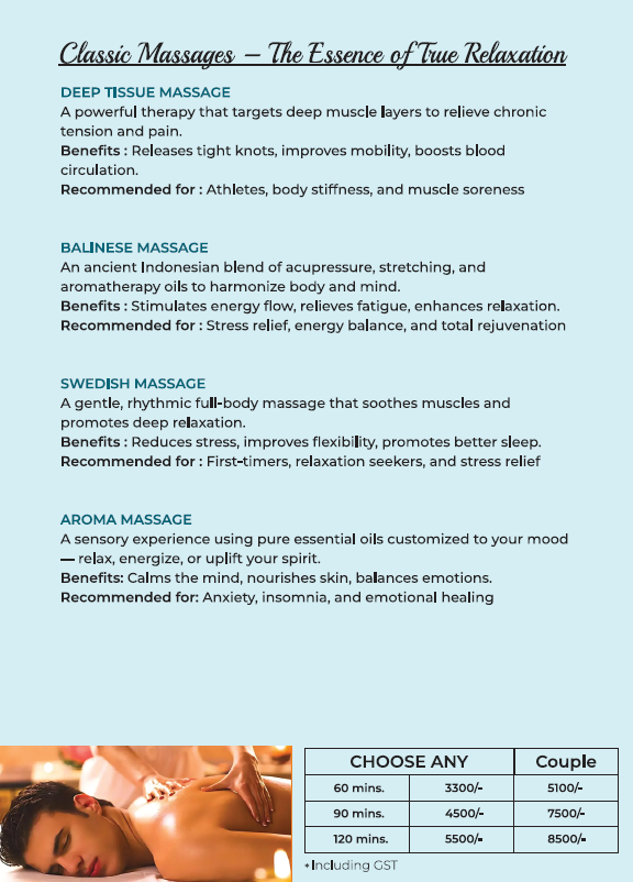 A calming massage experience designed for couples to unwind together in a private room. 60 Minutes - ₹5,800